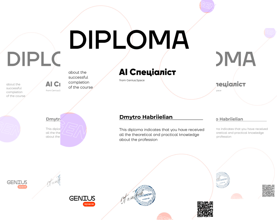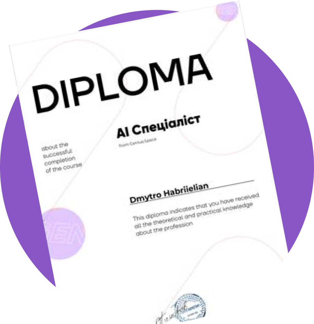 Після закінчення навчання ви проходите додаткове тестування та отримуєте диплом, який підтверджує, що ви – спеціаліст в області ШІ.