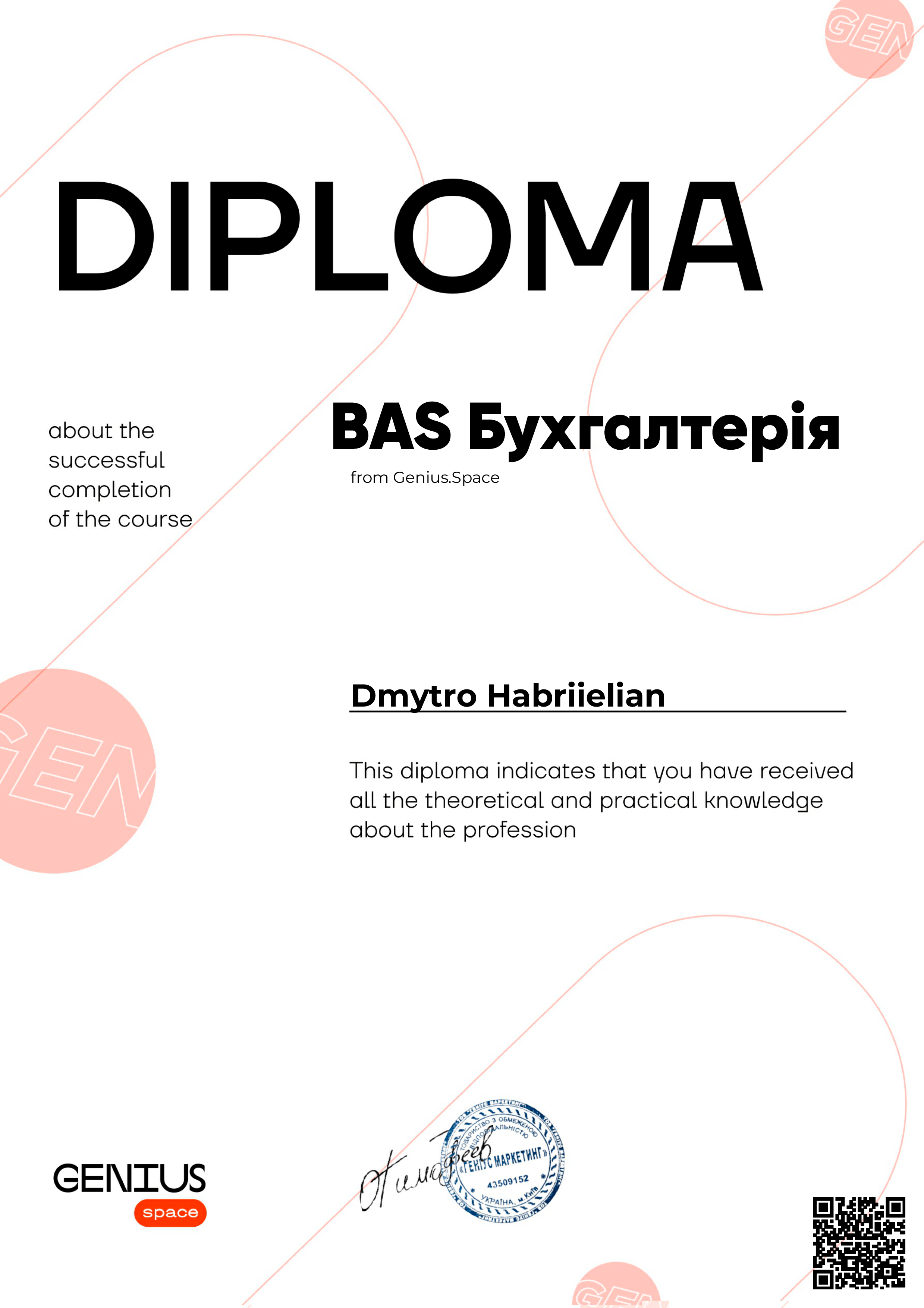 В рамках Genius Space ми надаємо вам диплом про успішне проходження курсу. Ваш диплом матиме QR код, просканувавши його, роботодавець може проаналізувати вашу статистику навчання - це допоможе при працевлаштуванні.