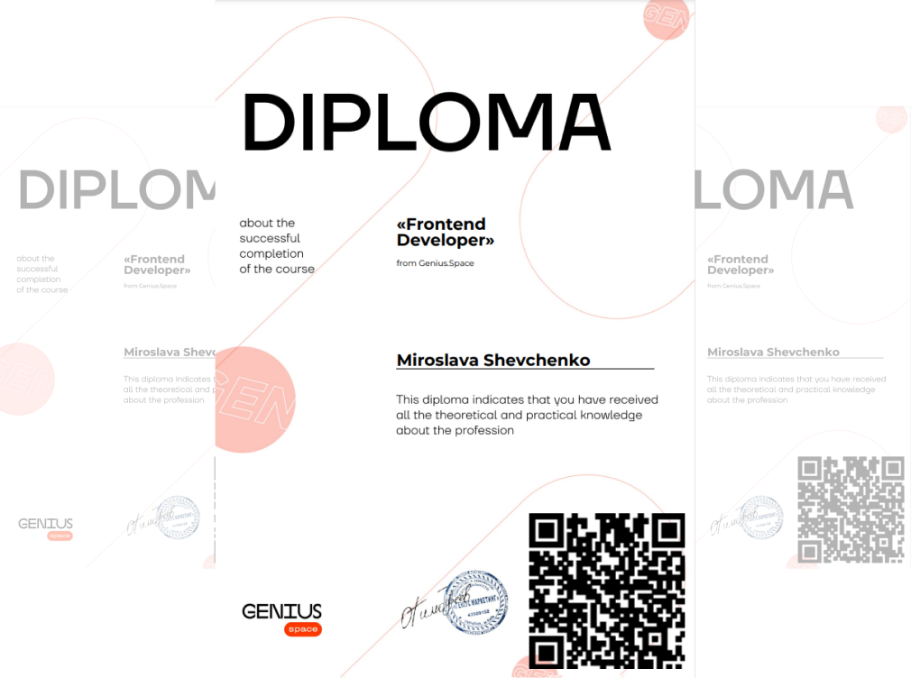 Після закінчення навчання ви проходите додаткове тестування та отримуєте диплом, який підтверджує, що ви – професійний Frontend-розробник.