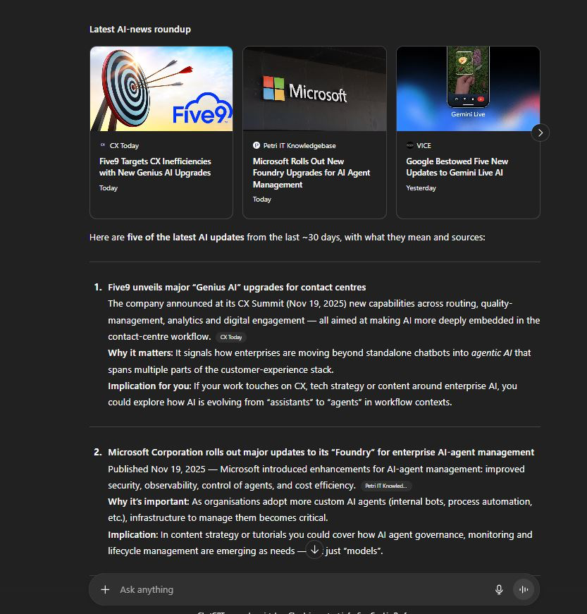 🔎 Запит: «Дай 5 останніх оновлень ШІ за 30 днів з джерелами».