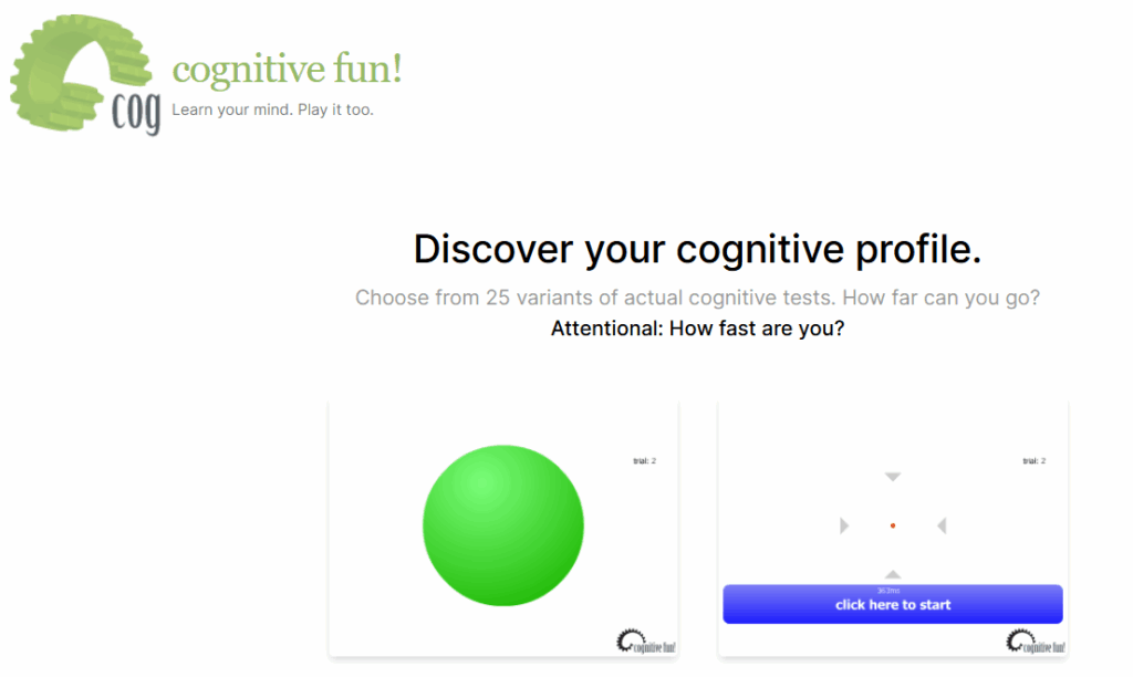 Cognitive Fun! — це мінімалістичний сайт, який на вигляд нагадує старі добрі флеш-ігри. Але не варто недооцінювати його простоту — це справжній тренажер для мозку, створений на основі класичних когнітивних тестів, що використовуються у нейропсихології.