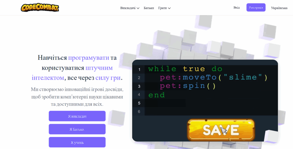 Гра побудована як пригодницька історія з рівнями, місіями, ворогами та нагородами. Але замість кнопки «атакувати» ти маєш написати hero.attack(“ogre”), а щоб пройти через лабіринт — описати алгоритм руху. І чим складнішим стає світ гри, тим глибшим стає твій рівень володіння кодом.