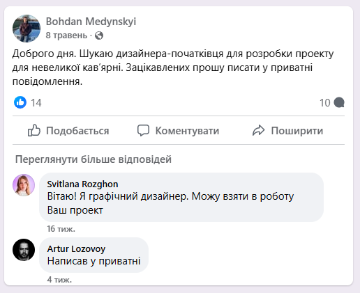 - Зайти в локальні спільноти або групи (власників кав’ярень, підприємців, молодих брендів) і запропонувати допомогу зі стартовим дизайном.