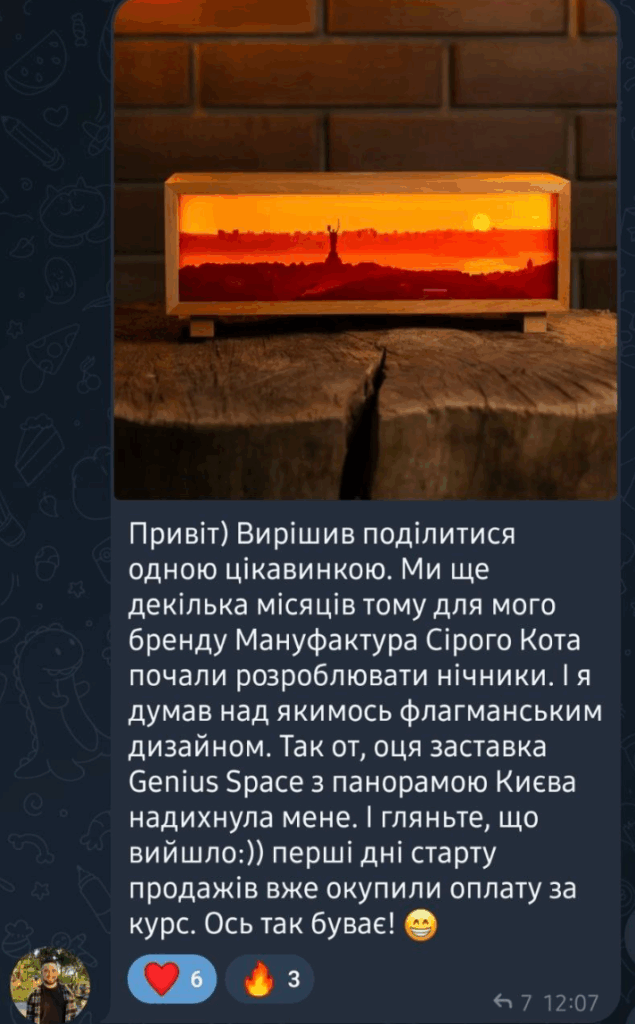 У 2025-му Петро вступає на курс «Комплексний інтернет-маркетинг» (КІМ) у Genius.Space, і саме тоді народжується ідея нічника-панорами — продукту, що згодом став символом домашнього тепла для багатьох клієнтів та отримав підтримку Валерія Залужного, Сергія Притули, Сергія Стерненка та фонду «Тихо».