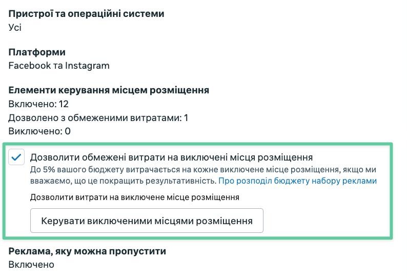 І ще одне оновлення, яке легко пропустити, але яке безпосередньо впливає на витрати. Meta додала налаштування, що дозволяє витрачати частину бюджету навіть на ті плейсменти, які ти виключив вручну.