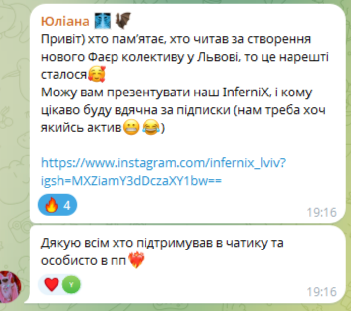 👉🏻 Юліана прийшла в колектив як артистка. Вона не збиралася займатися соцмережами, а просто хотіла крутити вогняні кулі і виступати на сцені. Але коли вона побачила Instagram колективу — зрозуміла: щось треба робити.