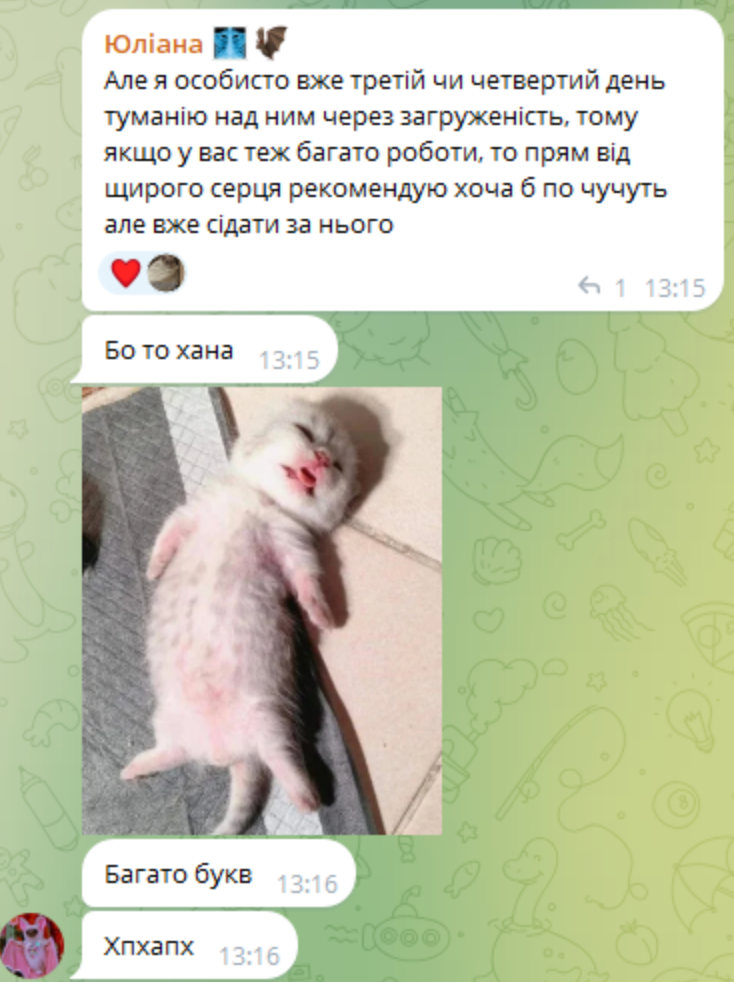📌 Юліана сиділа на роботі за касою і писала конспекти. Це було незвично, але й цікаво. Вона розмовляла про ці теми зі своїм оточенням, обговорювала, краще запам’ятовувала.