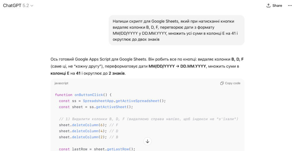 Ні. Сучасні AI-сервіси працюють через простий інтерфейс. ChatGPT може написати код для автоматизації таблиць — ти просто описуєш завдання звичайними словами, а він видає готове рішення з інструкцією, куди його вставити.