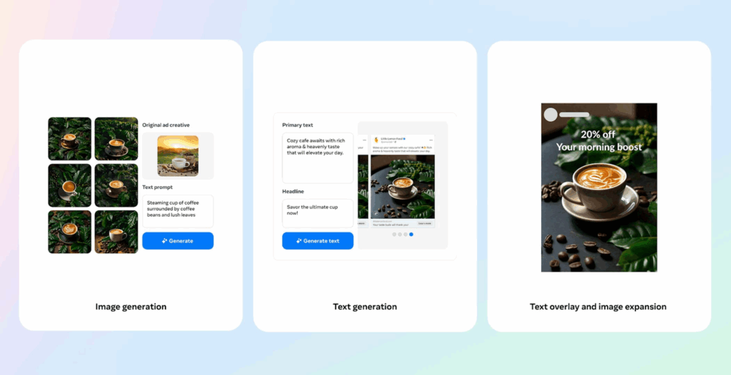 Головна фішка в тому, що Meta AI автоматично підтягує айдентику бренду — із твого сайту, минулих реклам або навіть із платформ на кшталт Shopify. Система розпізнає твій стиль і зберігає його в кожному новому креативі.