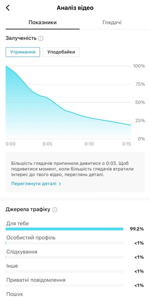 Один із ключових показників, які відповідають за результат відео, — відсоток глядачів, які додивилися його до кінця (його можна побачити в аналітиці під кожним роликом). При цьому яким саме чином ви цього досягнете (викликавши глядача на емоції, через маніпуляції, відвертою брехнею чи навпаки — позитивною інтригою, гумором, харизмою, трендовим аудіо) — по суті особливо не важливо. Найкраще «залітають» ролики, які набирають і перегляди, і лайки, і коментарі, і репости — а це трапляється тоді, коли ваше відео одночасно і приваблює, і інтригує, і викликає емоції.