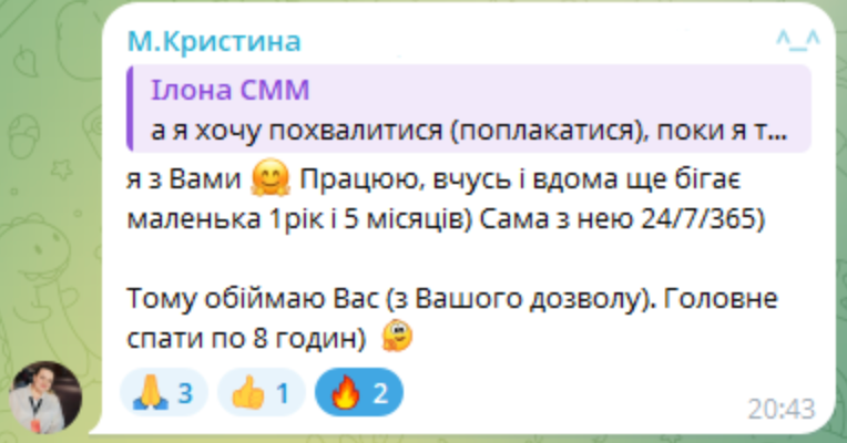 Але Кристина знайшла вихід. Вона дивилася лекції, коли дитина спала, робила завдання пізно ввечері або рано вранці, просила допомоги у кураторів, коли щось було незрозуміло та спілкувалася з групою, коли потрібна була підтримка.