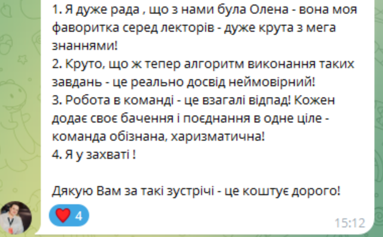 - що куратори завжди були на зв’язку і підтримували, розуміли, роз’яснювали — це дійсно варто дорогого;
