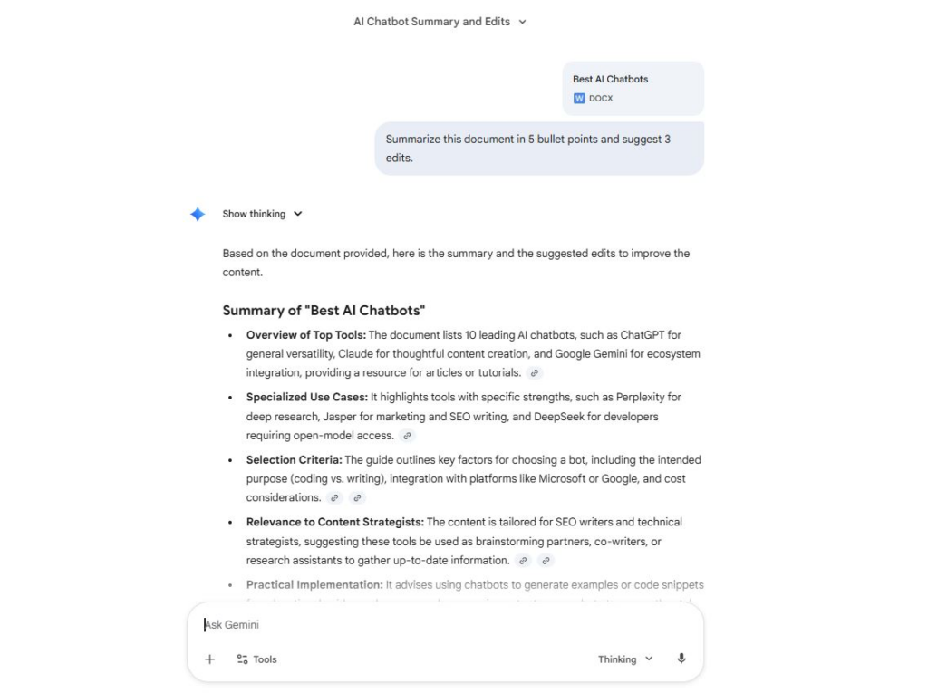 Эта задача показывает силу экосистемы Google. Когда документ уже в Drive, Gemini экономит время и не требует дополнительных действий.