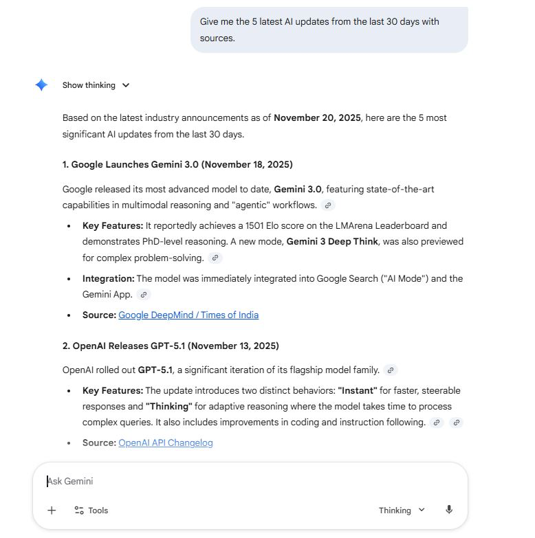 🔎 Запрос: «Дай 5 последних обновлений ИИ за 30 дней с источниками».