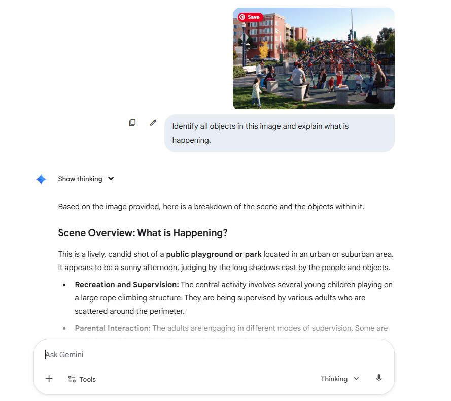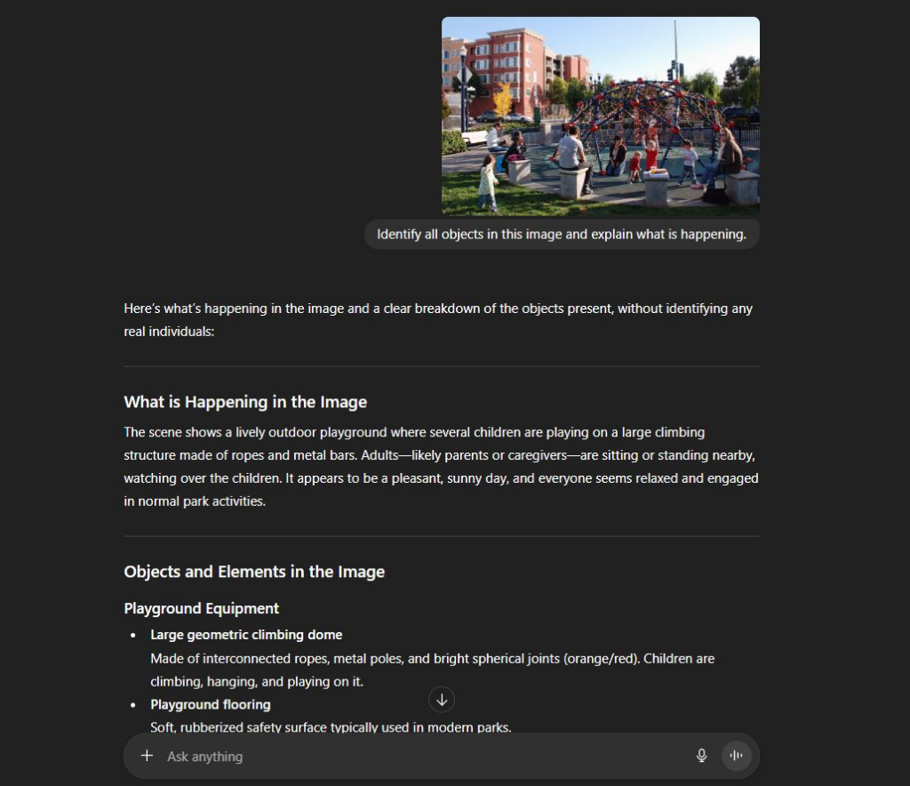 🔎 Запрос: «Определи объекты и объясни, что на нем происходит».