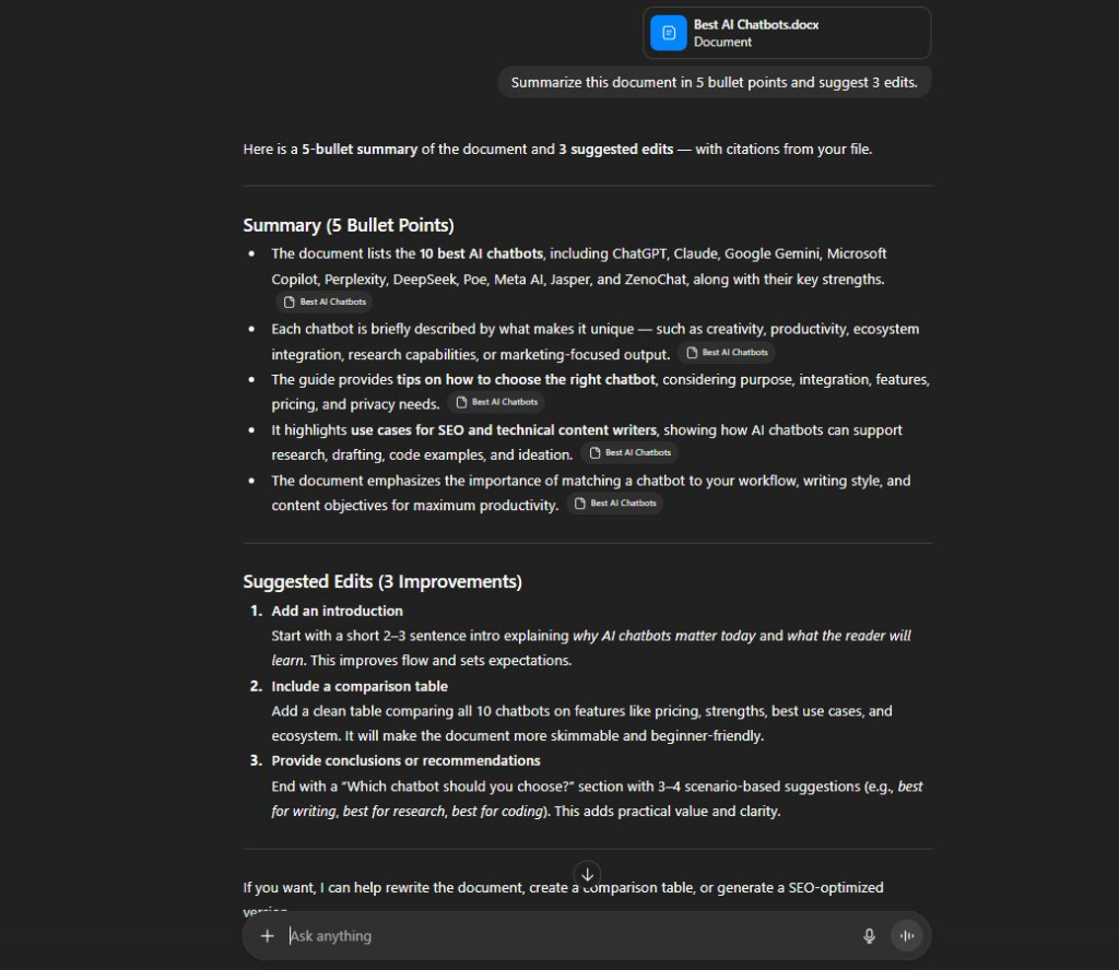 🔎 Запрос: «Обобщи документ в 5 пунктов и предложи 3 исправления».