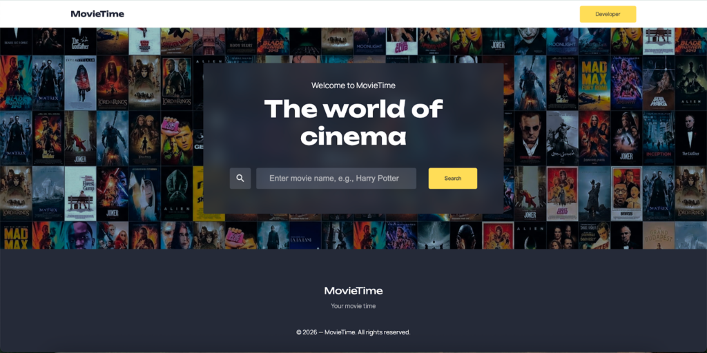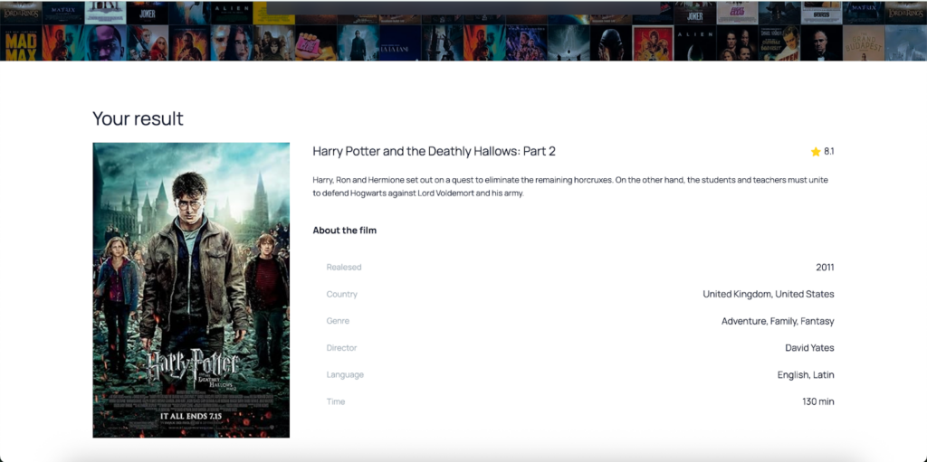 Уже во время обучения, после второго модуля, после изучения и освоения HTML, CSS и JavaScript Михаил самостоятельно написал небольшой поисковик фильмов с собственным дизайном и использованием API. Это был его первый полноценный проект, который он добавил в портфолио.