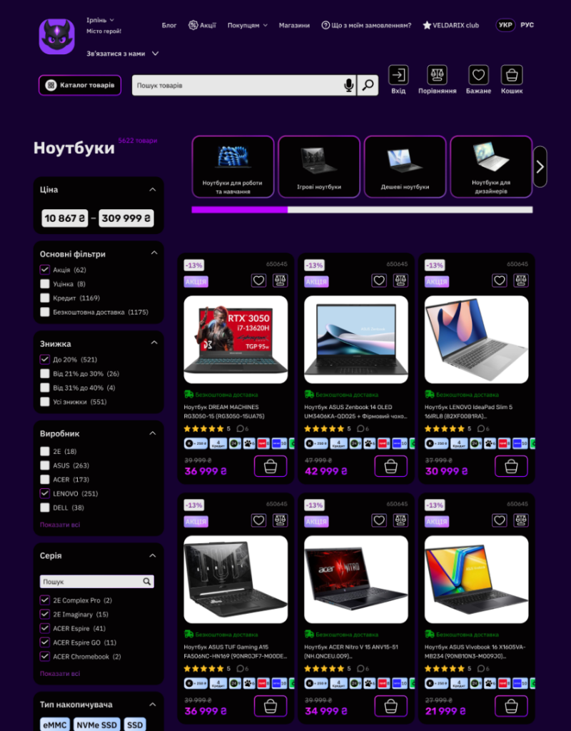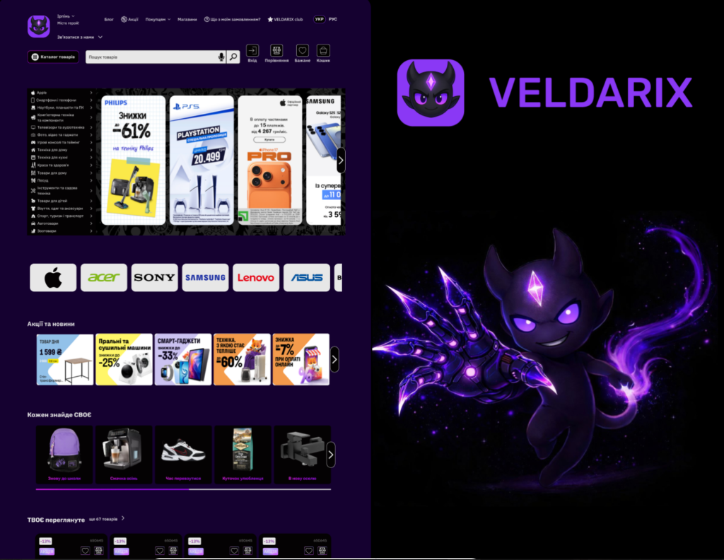 Дипломный проект Никиты — Veldarix, магазин техники в темных цветах с ~60 экранами (desktop + mobile), полным UX, UI, прототипами, UI-kit, адаптивами и более чем 300 связями в прототипе.