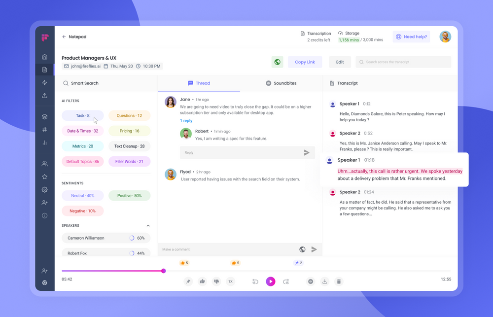 Это означает, что тебе не придется просматривать запись, делать заметки по памяти или тратить время на составление резюме вручную. Fireflies обеспечивает сохранение контекста и позволяет сосредоточиться на разговоре, не отвлекаясь на детали.