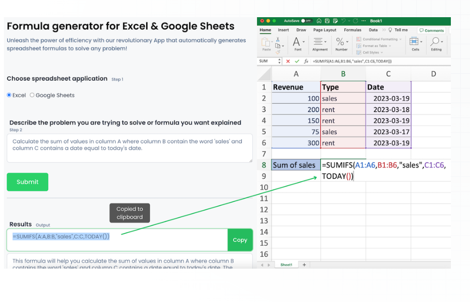 - ИИ генерирует формулу, которую можно сразу скопировать в Excel или Google Sheets.