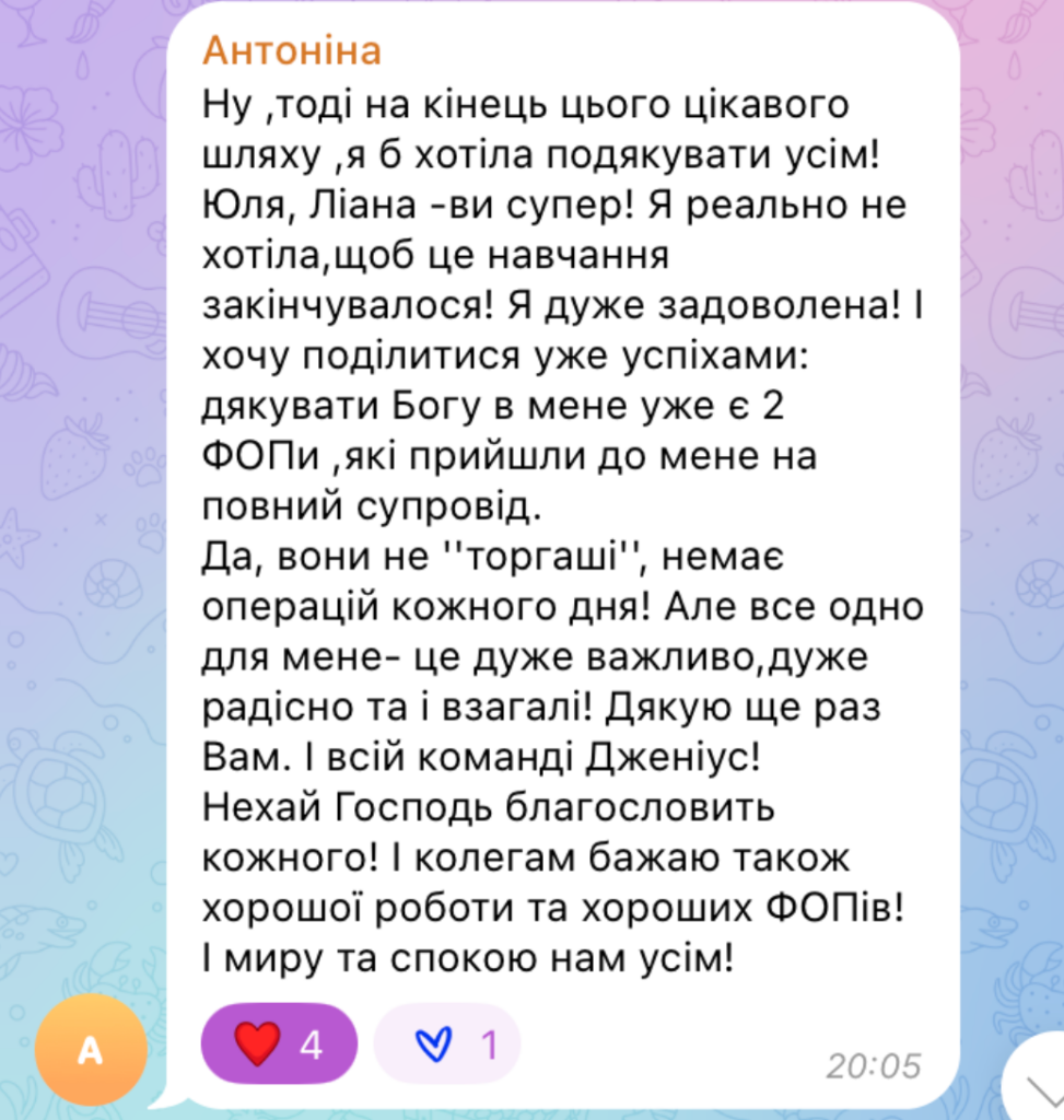 3. Получила первых клиентов еще во время обучения. На данный момент у нее два ФОПа 2 и 3 группы (5%) на полном сопровождении. А еще назревает ФОПчик на 1 группе — от регистрации до дальнейшего ведения. Это тот результат, который многие получают только через полгода после курса 🚀