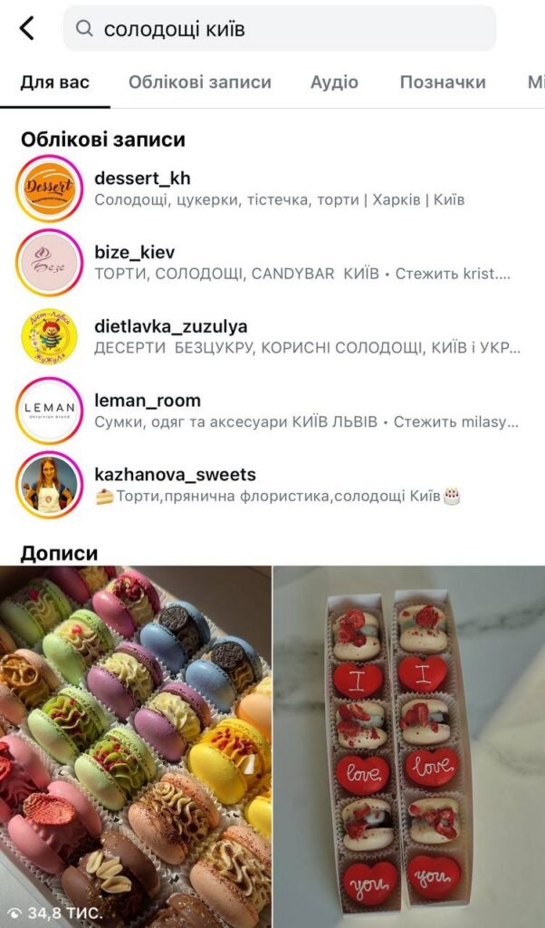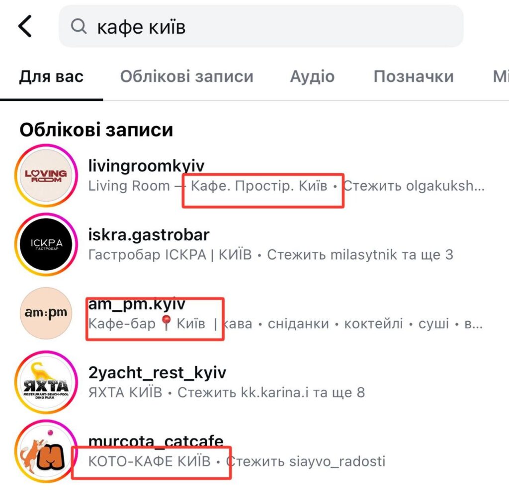 2️⃣ Поиск по аккаунтам работает иначе. Здесь важны имя профиля, юзернейм и описание в био. Если человек ищет «кафе Киев», алгоритм в первую очередь покажет профили, у которых эти слова есть в названии или описании.